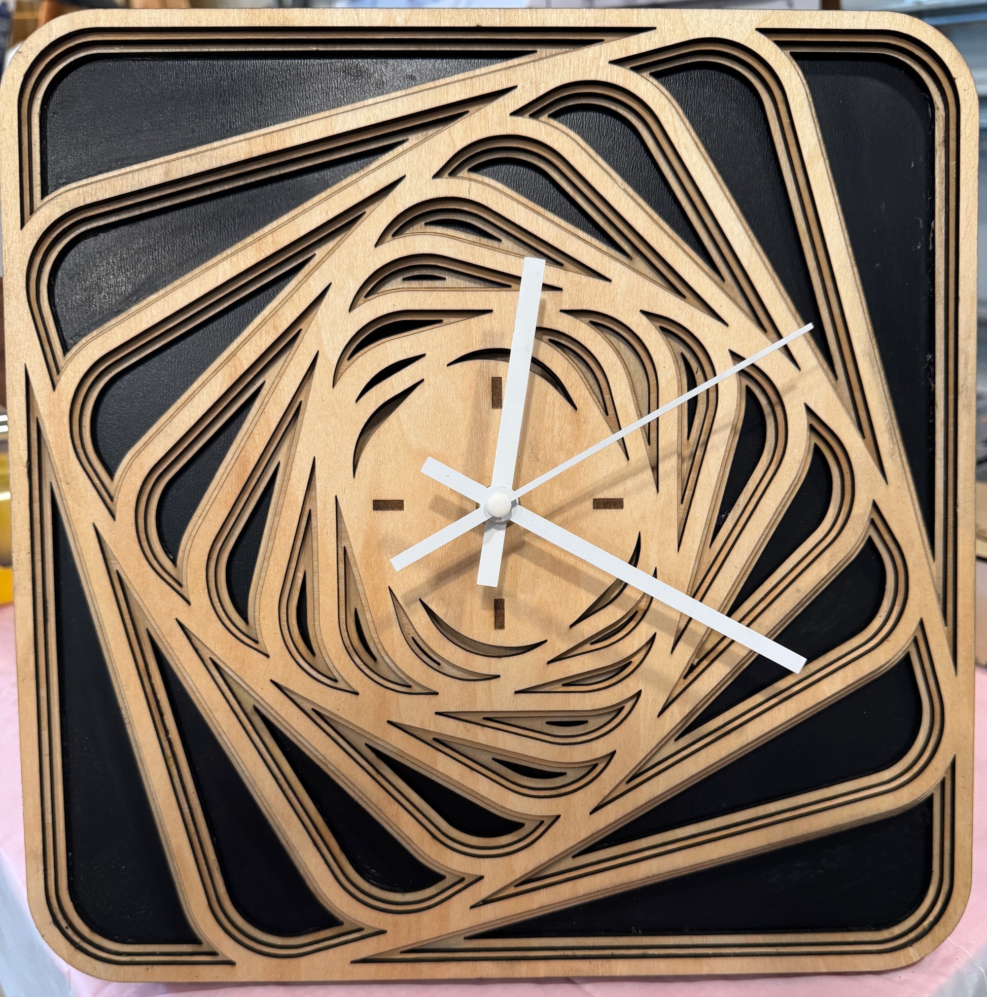 This 11.5" x 11.5" wooden clock features a striking black and white geometric design, meticulously hand-painted to ensure unique artistry and precision. Its minimalist shape complements modern interiors while providing reliable timekeeping. Crafted from durable wood, this clock offers both aesthetic appeal and functional durability, making it an excellent addition for those seeking a blend of contemporary style and craftsmanship. Other clocks available