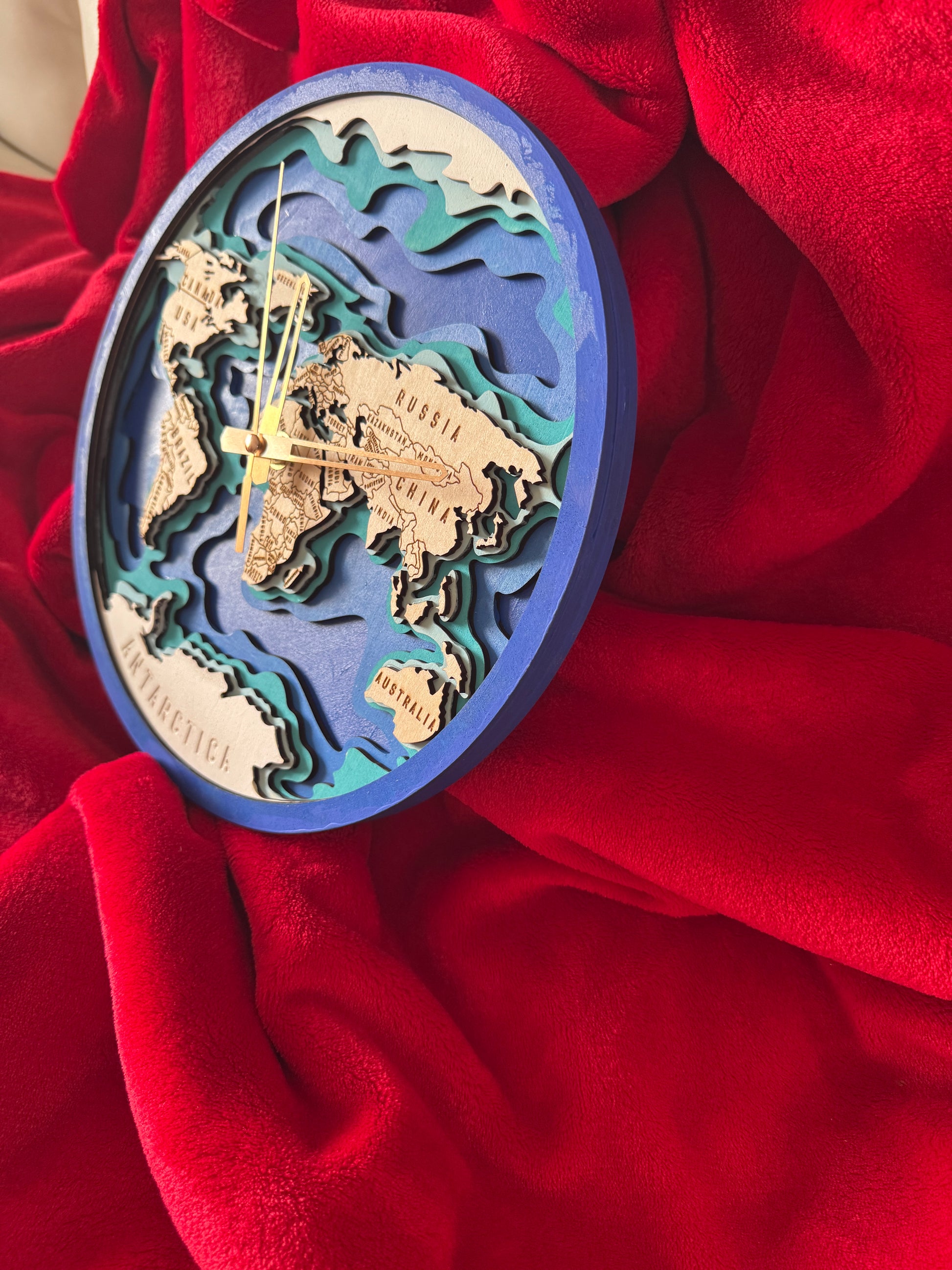 This expertly crafted world clock features a unique dimensional design on a sturdy wooden base, measuring 11.5 inches in diameter. Custom painted with durable acrylic paint, each clock showcases precise details that enhance both style and functionality. Ideal for tracking time across different time zones, it combines artistic craftsmanship with practical use for any modern space.